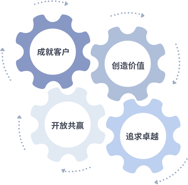 成就客户是一切决策的出发点,,,,创造价值是衡量所有工作的标准,,,追求卓越是我们做事做人的态度,,开放共赢是我们的格局也是最终的结果。。价值观的齿轮环环相扣,,,,推动着组织里的每个人不断向前。。
